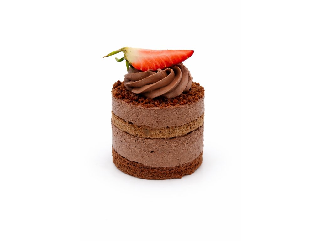 Čokoládový mini dortík- extra čokoládový korpus, pařížský krém, dozdobený ovocem.