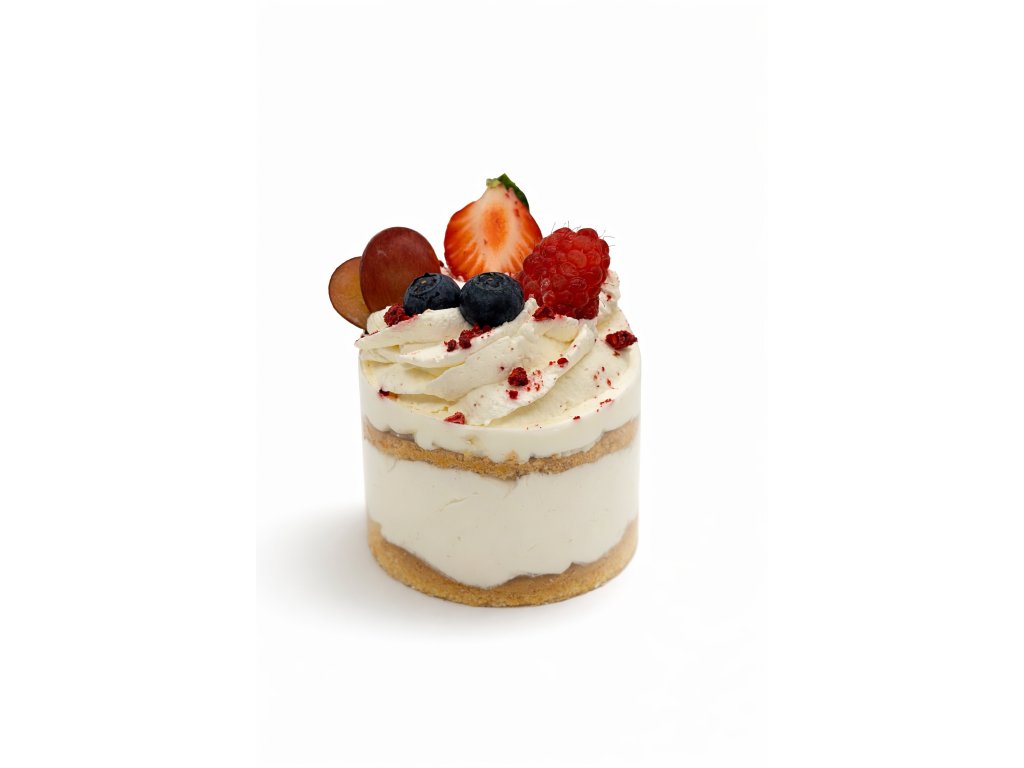 Mascarpone mini dortík ze světlého korpusu s jemným mascarpone krémem, doplněný čerstvým ovocem.