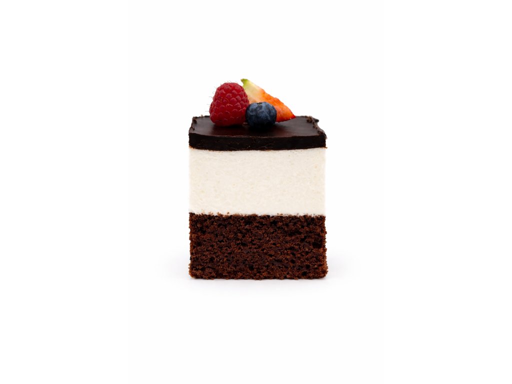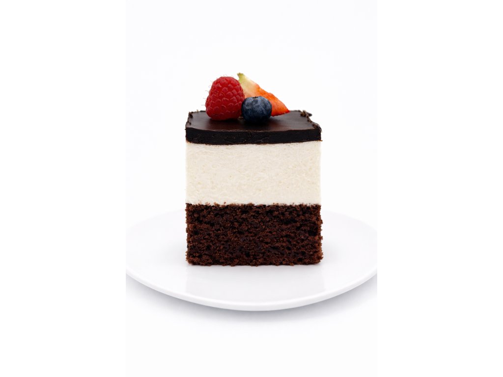 Oblíbená klasika v elegantním provedení. Vláčný kakaový korpus s kefírem tvoří základ, na který navazuje jemný tvarohový krém. Dezert je zakončený čokoládovou polevou a doplněný čerstvým ovocem, které dodává příjemnou svěžest.